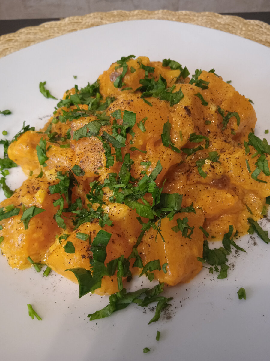 Друзья! Давайте приготовим сегодня тыкву , тушёную со сливками. Блюдо это вкусное и очень полезное. Его можно подать как гарнир к мясу, рыбе, птице или как самостоятельное блюдо. Очень вкусно будет, если дополнить его сыром с плесенью или другим рассольным сыром , типа брынзы А для приготовления нам понадобятся тыква, коробочка сливок 10-20 процентов жирности, соль, масло, мука и специи Для начала тыкву необходимо очистить от кожуры, нарезать крупным кубиком, сложить в миску. К тыкве добавить соль, муку и специи. Из специй я беру сладкую и копченую паприку, чёрный молотый перец, сушёный чеснок, куркуму. Всё тщательно перемешать, чтобы каждый кусочек был покрыт мукой и специями. Теперь на разогретой с маслом сковороде обжарить тыкву до румяной корочки Для пикантности добавим в сковороду 1-2 измельчённых зубчика чеснока и продолжим обжаривать ещё 3 минуты, периодически помешивая. Теперь добавим сливки и прогреем массу на слабом огне до загустения соуса. Если у вас нет сливок,то и