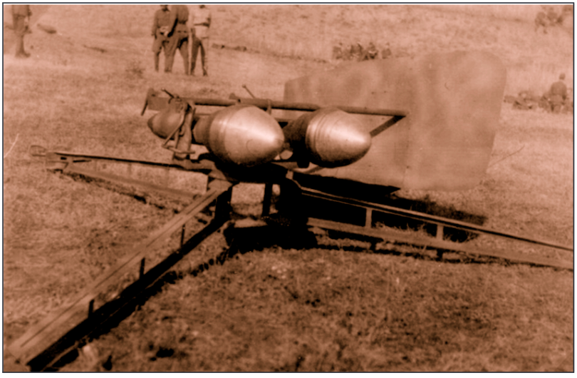 Пусковая установка “Булавомета” была простой и элегантной конструкцией. Она состояла из вращающейся рамы, сваренной из стальных труб, на которую крепились две трубчатые направляющие для ракет. Оператор располагался слева от установки, прикрытый от выхлопных газов двигателей небольшим щитом. Наведение установки по горизонтали осуществлялось простым поворотом рамы, по вертикали – с помощью приводной ручки и зубчато-реечного механизма. Для точного прицеливания, со стороны оператора имелся простенький оптический прицел.