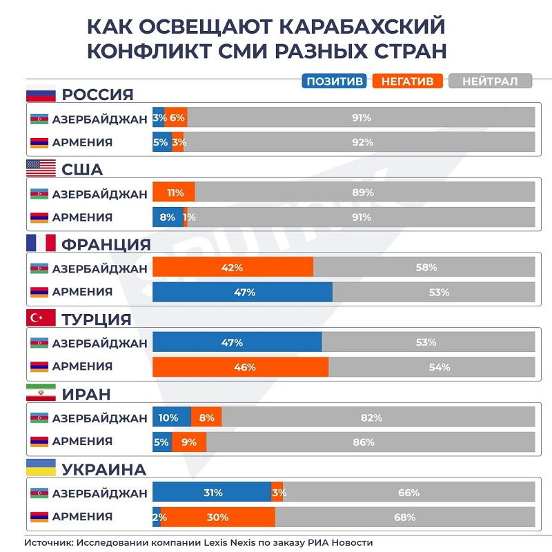 Хотя эта таблица времен Карабахского конфликта, но она дает ясное понимание чью сторону поддерживают СМИ разных стран и в мирное время. Разве что Россию и Украину можно рассматривать, как не характерный случай (для любых ситуаций) — у российских масс-медиа многое зависит от позиции Кремля по конкретному вопросу, а Украина связывала Карабах с Крымом. При этом, Россия и Иран придерживались в общем-то нейтральной позиции, с Турцией вроде тоже все ясно — она поддерживала Азербайджан открыто. А вот к двум западными странам, являющимися сопредседателями Минской группы, много вопросов. Судя по иконографике, ни США, ни Франция, не публиковали ничего положительного о Азербайджане. При этом во французской прессе был зашкаливающий негатив. И сегодня, эти "товарищи", пытаются опять пролезть на Южный Кавказ в роли арбитров. Смешные ... Из Тг-канала Марии Захаровой (запись 27 октября):