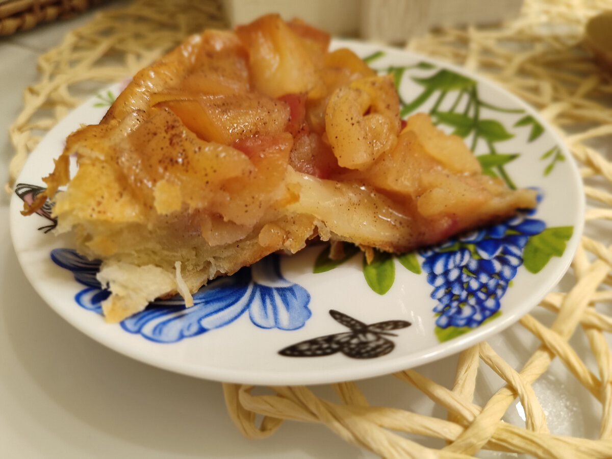 Ингредиенты: Яблоки - 2 шт. Сахар - 1-1,5 ст. л. Корица Сливочное масло- 30 г. Тесто слоёное дрожжевое - 1 лист Способ приготовления: 1. Яблоки нарезаем на небольшие кусочки. 2. Перекладываем в форму, в которой можно и готовить на плите и запекать. Посыпаем сахаром и перемешиваем. 3. Добавляем немного корицы и сливочное масло. Ставим на средний огонь и начинаем растапливать масло. 4. Пласт теста раскатываем до толщины 3 мм. 4. Карамелизуем яблоки, примерно 10-13 минут. 5. Выключаем газ и накрываем тестом, слегка проткнув его вилкой. Отправляем в разогретую до 180 градусов духовку на 25 минут. 6. Достаём из духовки, даём немного остыть и накрываем тарелкой. 7. Ловкость рук... Переворачиваем тарелку. Готово! Приятного аппетита!