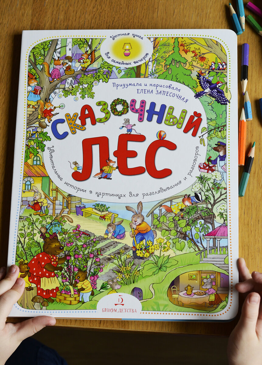 Речь идет о виммельбухах - книгах большого формата с яркими и очень детализированными иллюстрациями. Моей дочке они очень нравятся, причем независимо от рекомендованного издательством возраста. Первый виммельбух у дочки появился в 2 года. Сейчас ребенку почти 6 лет. Тот, первый, до сих пор с нами, и дочка с удовольствием его рассматривает и пробует самостоятельно читать короткий сопровождающий картинки текст. За 4 года коллекция книг разрослась, в том числе и виммельбухами. На днях появилась новая книга - «Сказочный лес. Удивительные истории в картинках для разглядывания и разговоров» Елены Запесочной и издательства «Бином детства». Это большая книга-картонка: 23,5 * 31,5 см из очень плотного картона со скругленными углами. В книге всего 6 разворотов: 4 разворота с рисунками, посвященным 4-ем временам года и 2 разворота с заданиями. Я поначалу расстроилась, так как решила, что книгу дочку давно переросла. Но с выводом я поторопилась. Дочка с огромным удовольствием рассматривает книгу,