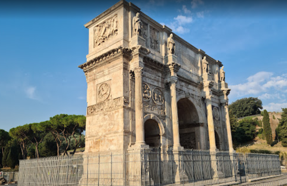 Арка Константина была построена в 315 году в ознаменование победы Константина I Великого в битве при Понте Мильвио . Она расположена между Колизеем и Палатинским холмом. Построенная из фрагментов других памятников, Арка Константина является одной из самых известных триумфальных арок, созданных в Древнем Риме . Она имеет высоту 21 метр, ширину 25 и образована 3 арками. В памятнике, выполненном из мраморных блоков, вы можете увидеть статуи с Форума Траяна и различные барельефы, такие как портрет Марка Аврелия , раздающего хлеб бедным, и изображение Траяна после его победы над даками. Надпись на верхней части, первоначально сделанная бронзовыми буквами, гласит: «Императору Цезарю Флавию Константину Массимо Пио Феличе Августо сенат и римский народ посвятили эту арку, отмеченную триумфом, потому что для стимула божественности и во имя величия разума он заявил со своей армией, посредством справедливой войны, государство как со стороны тирана, так и, в то же время, со стороны каждо