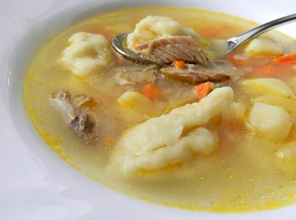 Суп с галушками — традиционное первое блюдо славянской кухни. Для приготовления нам потребуется: Перейдём к готовке: Шаг 1 Куриные голени моем и ставим вариться в солёной воде. Туда же в воду добавляем лавровый лист хмели-сунели и приправу для супов. Шаг 2 Пока курица варится, чистим и моем лук и морковь. Морковь трём на крупной тёрке, а лук нарезаем мелкими кубиками. Шаг 3 Потом овощи обжариваем в сковороде до золотистого цвета. Картофель чистим, моем и нарезаем кубиками. Шаг 4 Когда курица будет готова, её вынимаем из кастрюли, отделяем кости от мяса и мясо опять отправляем в кастрюлю с бульоном. Шаг 5 В кипящий бульон, с готовым куриным мясом, добавляем картофель и примерно через 10 минут добавляем туда же зажарку и недостающие специи. Шаг 6 В глубокой миске соединяем кефир и муку. Тщательно перемешиваем их. Потом тесто солим, перчим, добавляем соду и опять всё перемешиваем. Шаг 7 Когда все ингредиенты в супе готовы, добавляем в него галушки с помощью чайной ложки. Шаг 8 Варить суп