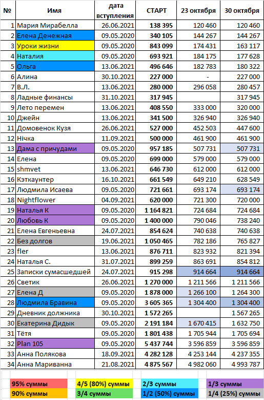 Всем привет! Вот она, наша замечательная красивая таблица. Самые внимательные могли заметить, что участников стало больше. Но сначала о грустном. Я так и не дождалась весточки от Анастасии, и она выбывает из Марафона, где занимала первое место с самым маленьким долгом - 102000. Надеюсь, у неё всё хорошо. Вчера я писала, что к нам присоединился новый участник - Дневник должника. А сегодня присоединились ещё двое: Алина и Ладные финансы (6 и 8 строчки). Поприветствуем и пожелаем удачи! И у нас осталось всего одно свободное место. Максимальное количество участников марафона - 35. Больше я не приму, таблица и так очень громоздкая получается. Ну что, перейдём к раздаче медалей? Кто же у нас погасил больше всех за эту неделю? На первом месте - Любовь К, погасившая 51806р, на втором - Екатерина Дидык (минус 37665р), ну а на третьем - Кэткаунтер (минус 20661р.) Поздравляем! А кто же погасил больше всех на этой неделе в процентах от долга? Смотрим: Любовь К. на первом месте и по сумме и по про