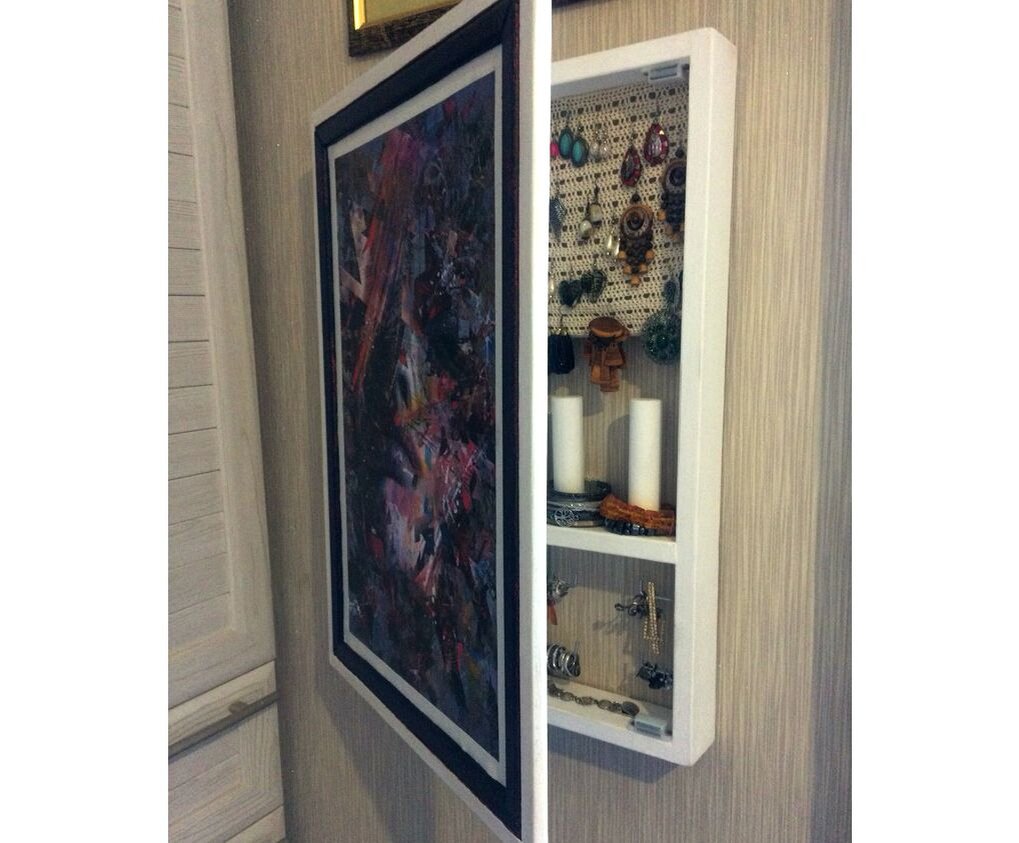 В самом верху размещаем вязанное трикотажное полотно, натянутое на пластиковую рамку, на которую мы будем вешать серьги со швензами в виде открытого крючка. Пластиковая рамка должна быть узкой, чтобы серьги были утоплены в глубину шкафчика. Рамку мы прикрепляем с изнанки мебельным степлером.