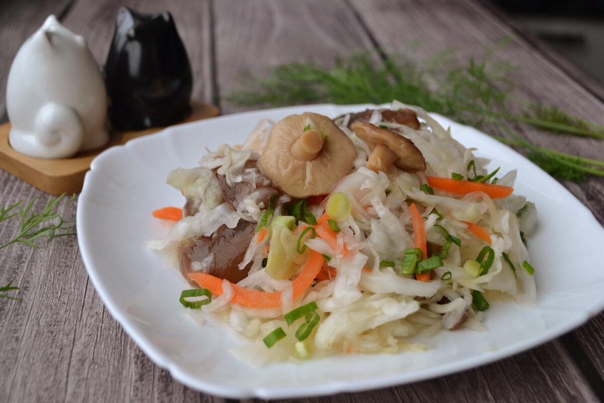 Всем привет! И как всегда огромнейшее спасибо, что нашли время заглянуть ко мне на страничку! Люблю быстрые и простые закуски, особенно когда нет лишнего времени стоять у плиты, потому как двое маленьких детей, а им нужно особое внимание, с первоклашкой учим уроки, а с младшенькой пытаемся научиться различать цвета, собирать логические картинки. Вообщем, что говорить любая мама у которой маленькие дети меня обязательно поймет.....Не отвлекаясь от темы, делюсь простым рецептом закуски, которая будет кстати к любому второму блюду... Итак, для самой быстрой и вкусной закуски беру маринованную капусту. Сейчас как раз настала пора заготавливать на зиму капусту, я уже запаслась :). И еще у меня всегда в запасе имеется баночка маринованных грибов, будь то это опята или грузди. Скажу честно с шампиньонами не пробовала готовить. Добавляем нарезанный зеленый лук и немного растительного масла, перемешиваем Вот и все быстрая закуска готова! Продукты: Капуста маринованная - 300 грамм Маринованные