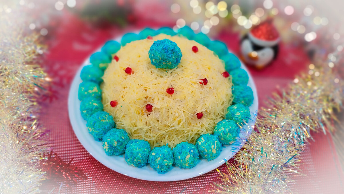 Ингредиенты: Куриное филе 300 гр Кукуруза консервированная 1 банка Ананасы консервированные 1 банка Сыр 150 гр Майонез 2 ст. ложки Соль, перец по вкусу Гранат 10 шт Для шариков: Масло сливочное 25 гр Творог 30 гр Сыр 100 гр Яйцо вареное 1 шт Чеснок 2 зубчика Кокосовая стружка голубая 30 гр Способ приготовления: Куриное филе отвариваем в подсоленной воде со специями. Нарезаем филе и ананас на мелкие кусочки. 150 граммов любимого сыра натираем на мелкой терке. Я беру сыры твердых сортом. Смешиваем все ингредиенты, добавляем банку консервированной кукурузы, майонез и перемешиваем. Солим, перчим по вкусу. Выкладываем в выпуклую глубокую форму и убираем в холодильник минут на 30. Ну а пока займемся шариками. В блендере смешиваем сливочное масло, творог, тертые яйца, сыр и выдавленный чеснок. Из полученной массы формируем шарики и обваливаем их в голубой кокосовой стружке. Цветная стружка продается во многих продуктовых магазинах. Найти ее не составит труда. Достаем из холодильника