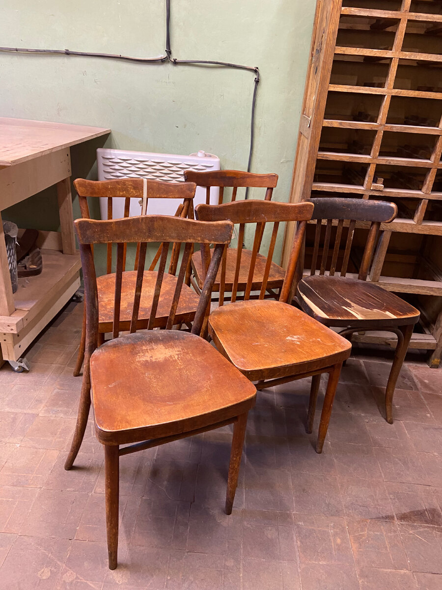 Поступили ко мне в работу несколько стульев, 4 стула, производства Псковской фабрики и один чехословацкий. По состоянию, как это всегда бывает, изрядно повидавшие виды, но ещё можно спасти. Сиденья на всех пяти потрепаны больше всего, но сиденья- это расходный материал. Первым делом дефектовка и разбор на запчасти. В ходе дефектовки стало ясно, что два сиденья не спасти и нужно делать новые, а остальные требуется лишь подклеить. Чтобы обеспечить полный объём работы и не отвлекаться, сразу вырезал оба заменяемых сиденья . Далее перехожу к черновой зачистке. Это самый трудоёмкий этап, но довольно эффектный. Так из кучки старых грязных дровишек, получается кучка чистых дровишек) После зачистки начинаю шлифовку. С новым сиденьем куда лучше. После шлифовки самое приятное- покрытие. В этом случаем стулья будут покрыты в два разных покрытия и оттенка. Сначала масло. Покрываю в два слоя и отправляю сушиться, а сам приступаю к остальным элементам. Теперь грунт и краска. Сочетание хо