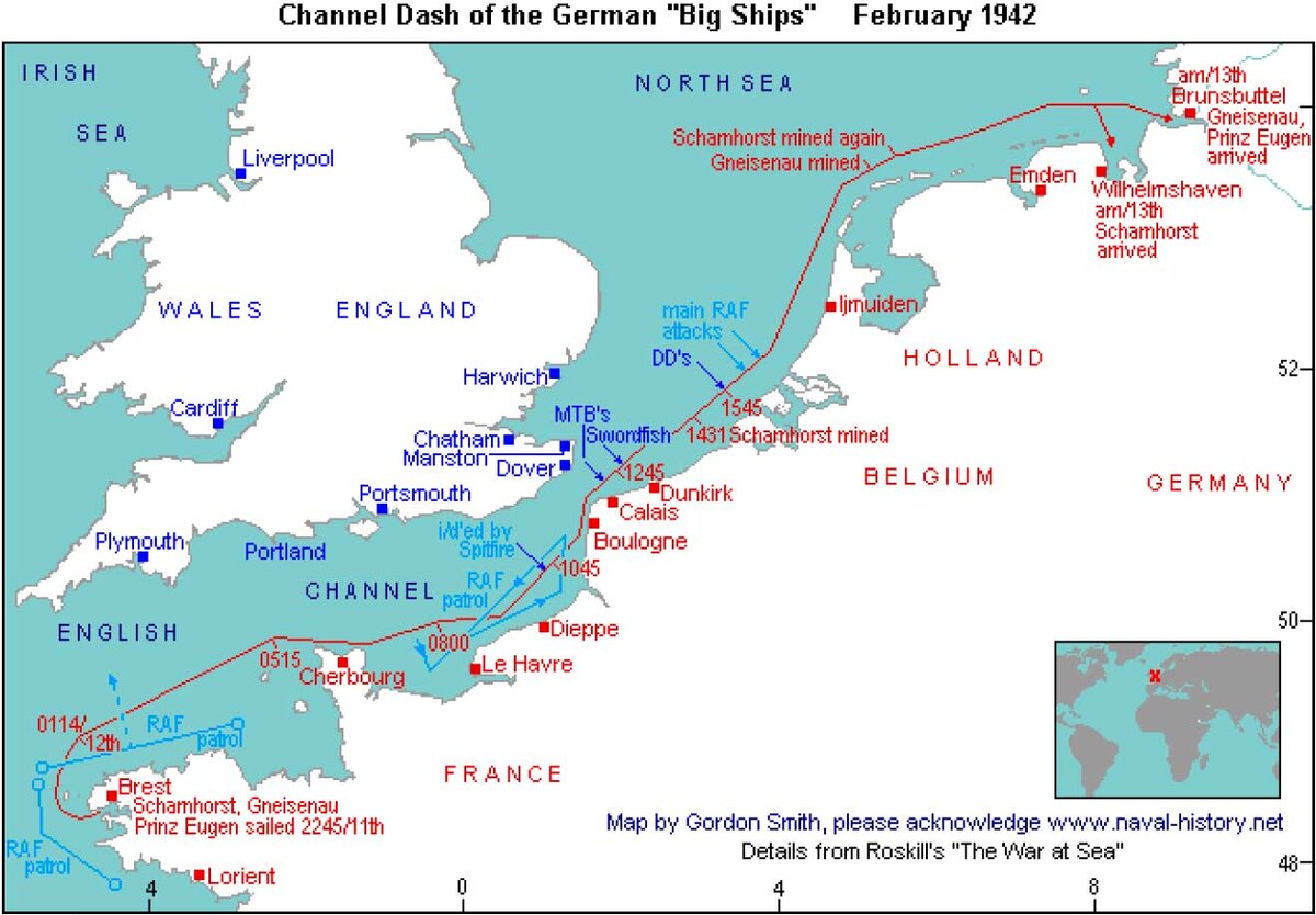 ... Циллиакс разрабатывает план прорыва через Ла-Манш. Операция получила название “Цербер“. Выход из Бреста был назначен на 19-30 11 Февраля 1942г. За несколько дней до этой даты немецкие тральщики стали очищать от мин фарватеры, но делали они это в открытую, как бы занимаясь контрольным тралением. В это же время связисты Люфтваффе принялись глушить, вроде бы бессистемно, британские береговые радары, приучая их персонал к “случайным“ помехам. Понимая, что залог успеха операции – полная внезапность, немцы предприняли беспрецедентные меры по дезинформации противника. Так, незадолго до 11 Февраля на борт кораблей, в открытую приняли машинное масло, применяемое при плавании в тропических широтах.Тогда же интенданты выдали со складов морякам комплекты тропической формы. 10 Февраля командиры и старшие офицеры получили приглашение на банкет, который должен состоятся в 20-00 12 Февраля в Париже, в ставке командующего Кригсмарине гросс-адмирала Редера. В тот же день должен был состоятся приём в честь военных моряков у коменданта Бреста, жёны многих офицеров предупредили французскую прислугу, что их мужья до утра отпущены на берег. Естественно, всё это сразу же стало известно британской разведке. Англичане решили, что в ближайшее время немецкая эскадра в море не выйдет, а позже отправиться на юг, в Средиземноморье или Южную Атлантику. Однако, нельзя сказать, что британцы не считались с возможностью прорыва через Ла-Манш. Для противодействия этому был разработан план “Фуллер”. Согласно ему, английские самолёты сбросили донные магнитные мины на немецкие фарватеры, минные заградители выставили новое заграждение между Уэссаном и Булонью, береговые батареи, подразделения торпедоносцев и бомбардировщиков, дивизион эсминцев были приведены в боевую готовность. Была усилена флотилия торпедных катеров в Дувре. В районе Бреста, острова Уэссан и между Гавром и Булонью постоянно барражировали самолёты-разведчики и, наконец 11 Февраля, к Бресту, для наблюдения за немецкой эскадрой направилась подводная лодка “Силайон“. Казалось бы всё под контролем, но, тем не менее…