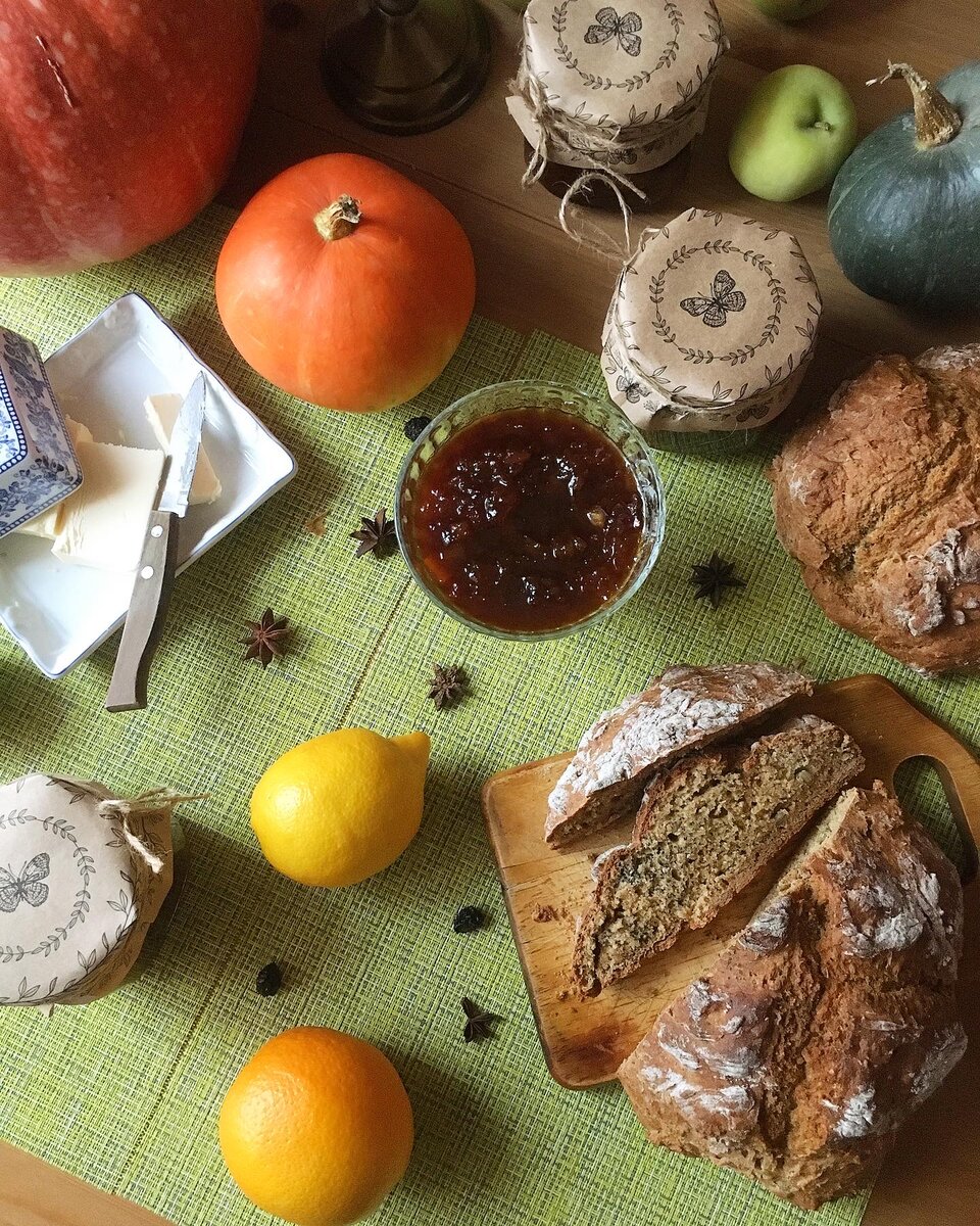 Праздник на букву «Хэ» у меня прижиться не мог. Суть его потому что, как принято нынче говорить, «ну, такое себе». Вместе с тем, Самайн, он же Самхейн, воспринимается приятнее. И он к тому же удачно совпадает с периодом, который в нашей стране в пору называть «тыквенным спасом» 😄 В этом году точно. Потому что тыкв на рынке - тьма. А как пройти мимо них, не унеся ещё парочку? Вот и я не умею. «Мам, у нас тыквенный склад! Нам куда столько тыквы?!», - недоумевает дочь. «Вопрос неверный. Нужно спрашивать не «куда», а «для чего». Потому что ответ на «куда» - конечно, домой. А ответ на «для чего»… А тут вот и подумаем», - ответила я, пакуя очередных малюток в пакет. Но буквально в тот же день мне попадается рецепт тыквенного конфитюра. А следом - хлеб. Без дрожжей. Без выжиданий. Без вымешивания. Да, с глютеном. Да, с сахаром. Да, с яйцом. Да, с молочкой в составе. Но я это готовлю. Несмотря на то, что сама крайне редко ем все подобное. Но ем. Оч изредка - да. По желанию. Захотела хлеба - с