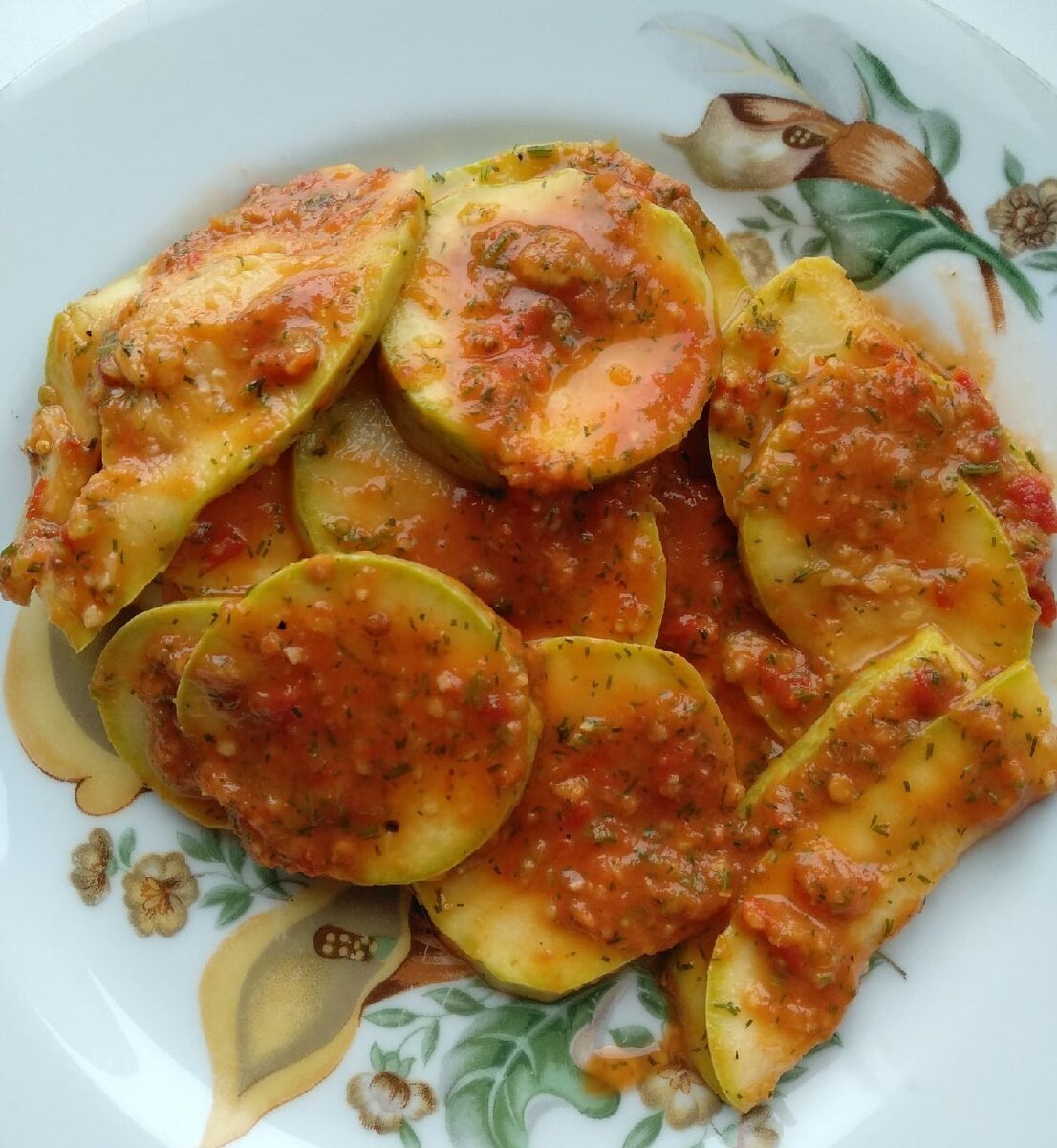 Этот рецепт можно использовать как гарнир и как самостоятельное блюдо. Оно вкусно и полезно для здоровья. Два кабачка - это примерно 800 гр, разрезать поперек. Затем нарезать кабачки тонкими пластинками толщиной 3-4мм или тонкими кружочками. Чем тоньше, тем лучше пропитаются. Кабачки сложить в миску, залить их кипятком и закрыть крышкой. Делаем заправку. Интредиенты: 250 -300 гр - помидоров 20 гр - зелени (укроп, петрушка, кинза) 5-6 зубчиков - чеснока 1 ч л - кориандра 1 ч л - соли 1 ч л - меда или сахара 3 ст л - лимонного сока или яблочного уксуса 2-3 ст л - растительного масла Все мелко нарезать и сложить в бдендер. Измельчить. Достать кабачки из воды. В миску положить первый слой кабачков с небольшим нахлестом и слегка посолить. Сверху на кабачки вылить 4 ст л заправки и ложкой распределить ее по всем кабачкам. И так сделать несколько слоев. Затем закрыть крышкой или пищевой пленкой. Поставить в холодильник минимум на 30 минут. Чем дольше кабачки стоят в холодильнике, тем
