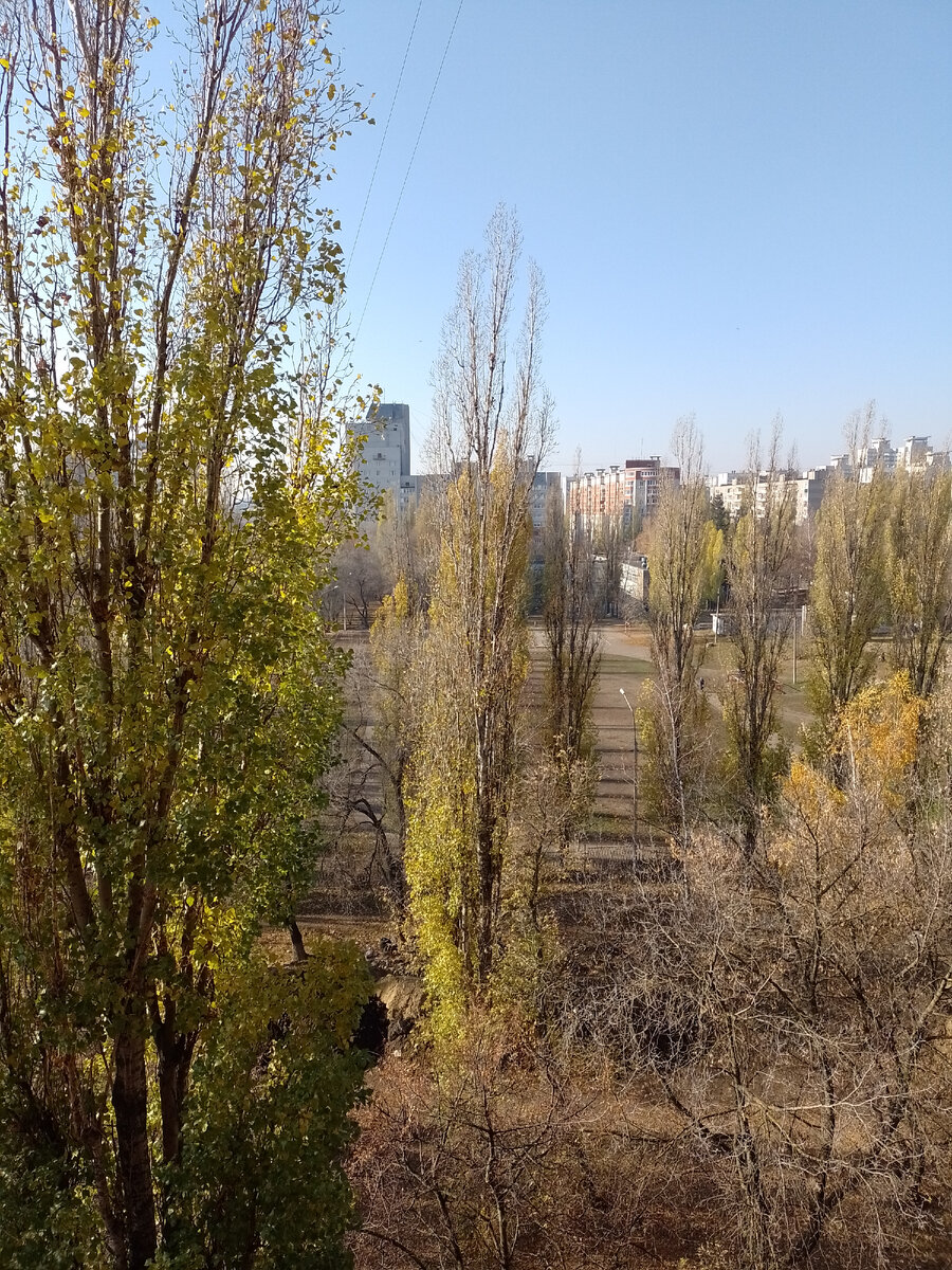 Мои окна выходят на стадион имени Л.И. Яшина сегодня последний день октября 2021 года и по его началу видно какой чудесный день впереди На стадионе не очень людно, но так бывает не всегда. Сейчас школьные занятия проходят удаленно и нет школьников, а они составляют большую часть посетителей данного стадиона. Но мы не будем останавливаться здесь и перейдем, а точнее прогуляемся дальше зайдем в парк Победы Последняя листва покидает деревья, осень самое красочное время года только ели на "Аллеи Памяти" остаются всегда зелеными. И у каждой из них есть табличка с именем тех героев Еще немного погуляв по парку и полюбовавшись многоцветием осени я продолжил свой путь в направлении Северного лесопарка. Обычно полностью заставленная автомобилями парковка возле ТЦ Арена сегодня пустует. И вот я прохожу гостиницу "Бенефит Плаза" и жилищный комплекс "230 футов" И попадаю в лесопарк Северный состоящий в основе своей из хвойных деревьев, когда-то это был огромный участок леса простирающегося до об