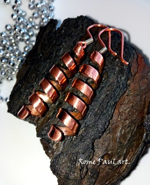 Медные авторские серьги из кованой патинированной меди. Стильные спирали выгодно выделят вас из общего потока модников. Вы сразу ощутите пристальное внимание не только противоположного пола, но и подруг... МАТЕРИАЛЫ: кованая патинированная медь Длина серьги: 70 мм ...Спираль - символ циклических ритмов: смена времен года, рост и убывание луны, рождение и смерть человека. Спираль - ритм жизни. Спираль - символ движения к центру. Движение к просветлению и мудрости, поэтому спираль часто изображают в виде свернувшейся змеи (символ мудрости). Спираль связана с Душами Богов и королей, рептилиями и энергией Кундалини. По древнеегипетским понятиям, меди покровительствовала богиня Хатхор - символ любви и олицетворение начала и продолжения жизни, которая одновременно покровительствовала и малахиту. Символом жизни богиня любви считалась и на острове Кипр, где около 1500 г. до нашей эры возник новый центр добычи меди, а самородная медь здесь была найдена примерно в 4000 г. до нашей эры... НЕТ В Н