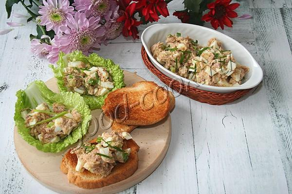 С этим салатом можно поэкспериментировать. Например, добавить немного свежего огурца или консервированной кукурузы. Вместо зелёного лука можно положить мелко нарезанную луковицу, предварительно ошпарив кубики лука кипятком и промыв холодной водой. Категория: Салаты с рыбой и морепродуктами, Простые рецепты СОСТАВ 1 банка консервированного тунца 3 варёных белка 2~3 побега зелёного лука ЗАПРАВКА 3 варёных желтка 2~3 ч ложки неострой или 1 ч ложка острой горчицы 2 ч ложки лимонного сока (10г) 2 ст ложки растительного масла (35г) щепотка соли перец посмотреть калорийность» Заправка