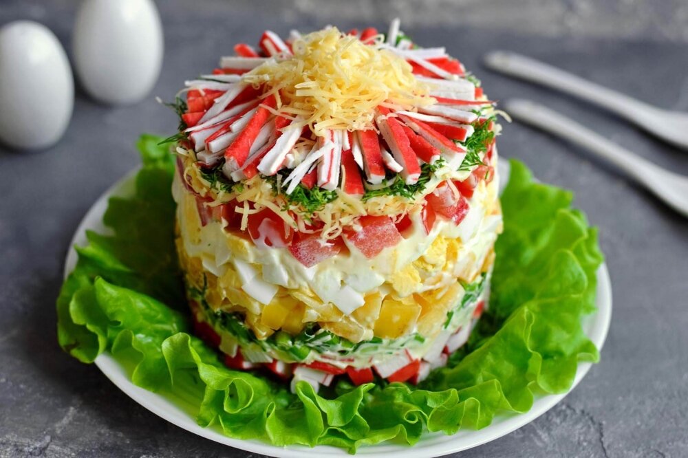 Рецепт нового слоеного салата для праздничного стола. Главным ингредиентом салата являются крабовые палочки, именно они и задаю основной вкус блюдо. Крабовые палочки дополняются свежими овощами и зеленью, яйцами и сыром. Поскольку все компоненты имеют разные цвета салат получается очень ярким и красочным. Для пропитки слоев самостоятельно готовим соус на основе сметаны, майонеза, горчицы и зелень. Такой соус делает вкус салата более насыщенным и интересным. Ингредиенты: Соус: Приготовление: На плоскую тарелку выложите лист салата, сверху установите формовочное кольцо. Крабовые палочки заранее разморозьте, небольшую часть палочек отложите для украшения салата. Остальные нарежьте средними кубиками, выложите нижним слоем, смажьте соусом. Соус предварительно приготовьте из майонеза, сметаны, горчицы и укропа. Зеленый лук нарежьте, присыпьте им крабовые палочки, сверху сделайте не густую сетку из майонезно-сметанного соуса. Желтый сладкий перец нарежьте крупными кубиками, выложите следующим