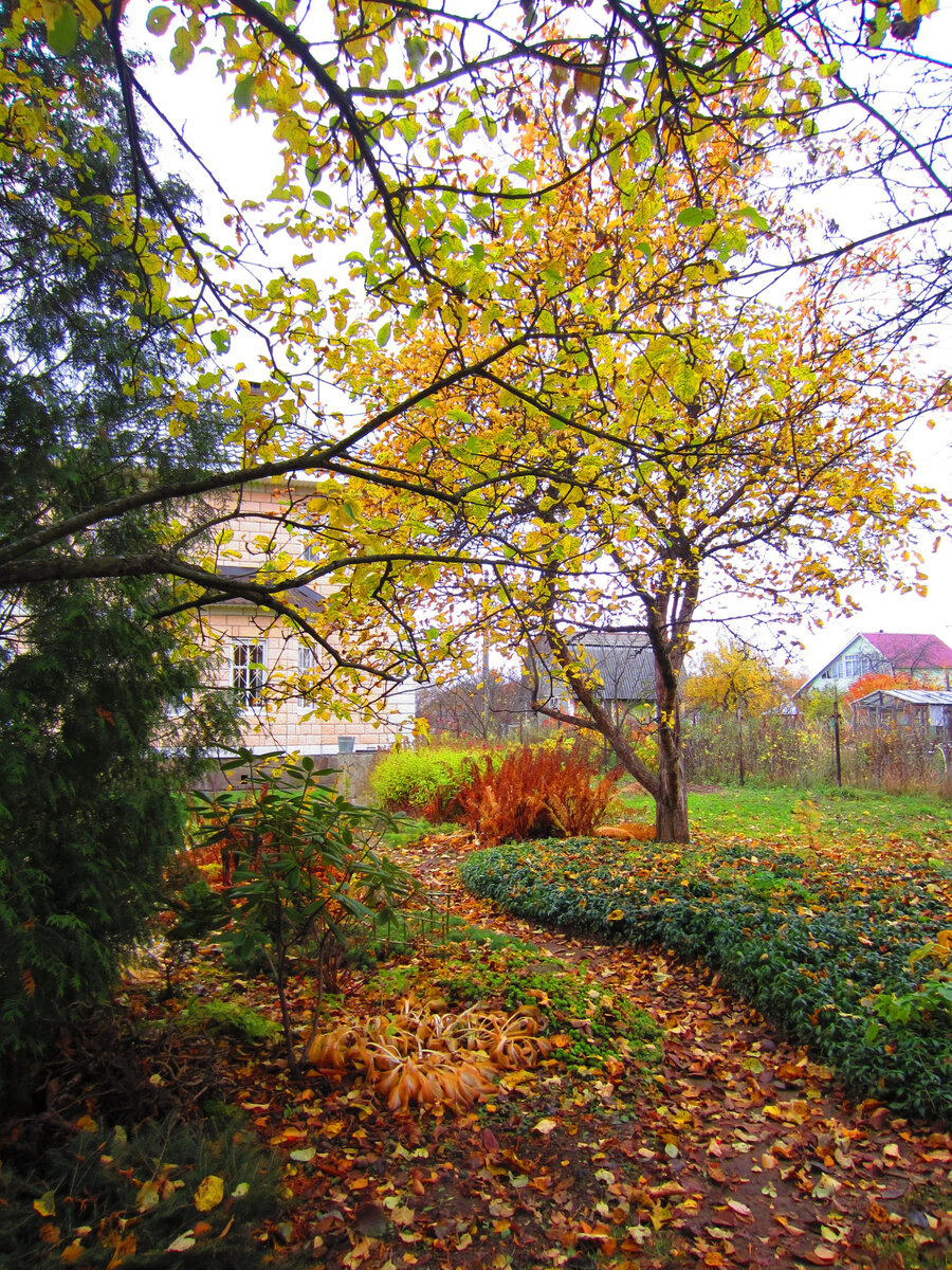 Листья этих деревьев оставляем там, где упали или отгребаем к линии забора