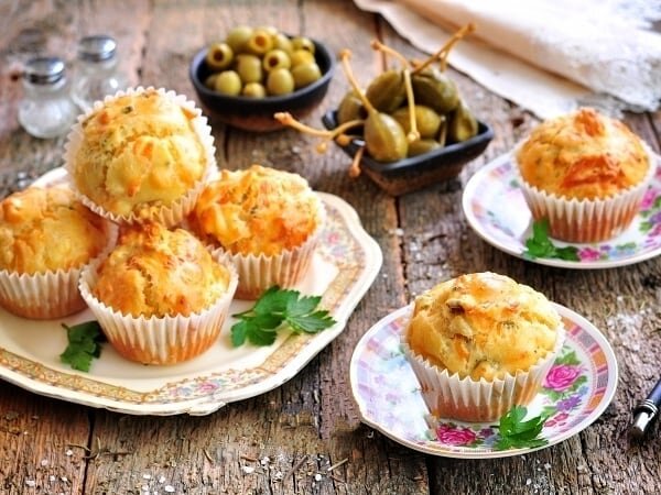 Выложите 1 столовую ложку в формы для кексов. Тесто с горкой. Запекать куриные кексы с сыром при 180 градусах 30 минут.