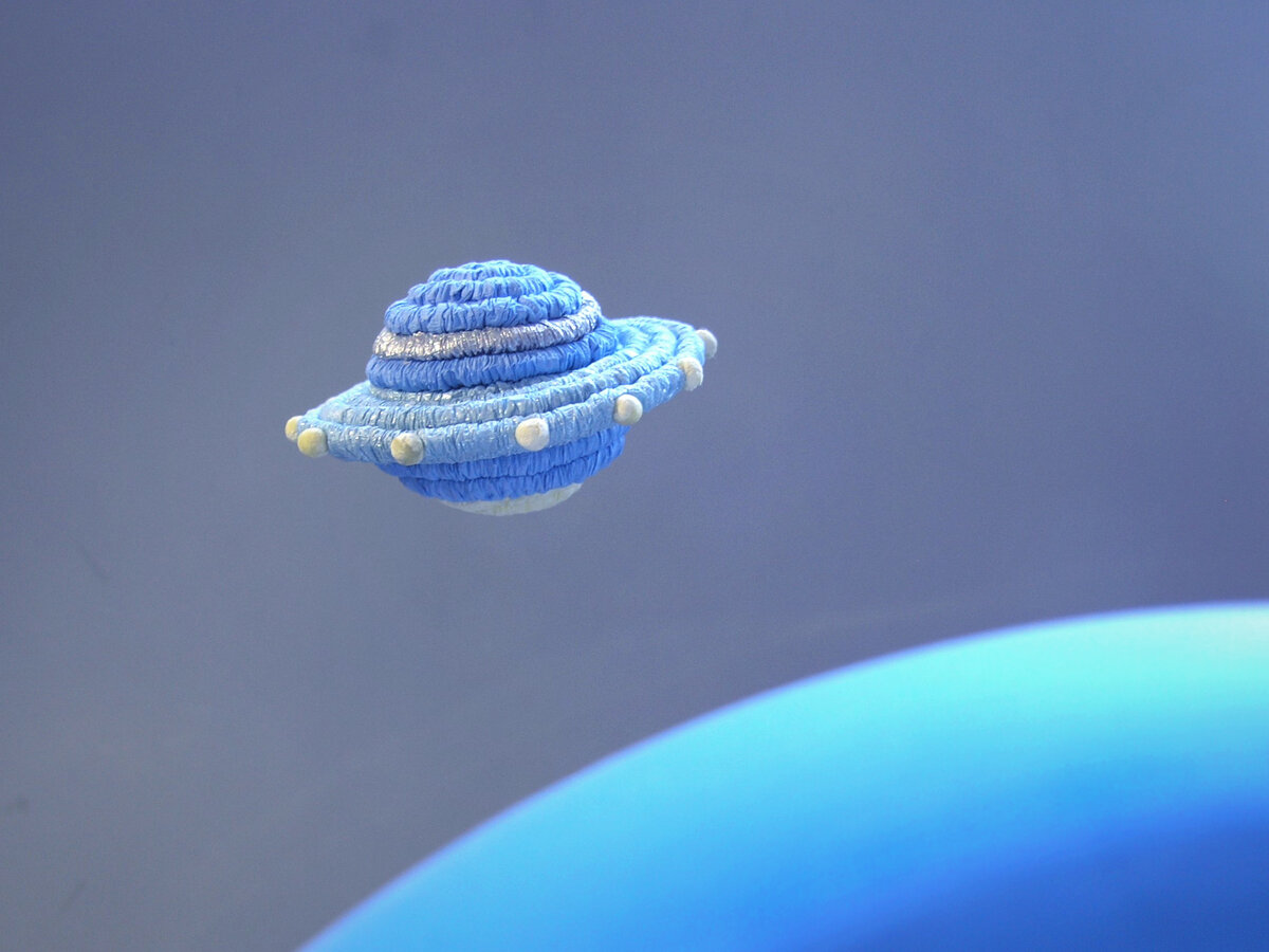 Как мы уже рассказывали, нас посетили жители планеты Gaufrer. Бортинженер рассказал нам о конструкции летательного аппарата, и мы сейчас попробуем его сделать. Нам понадобятся два газетных листа размером А4, две салфетки, 4 голубые, 5 серых, 1 жёлтая и 2 гофротрубочки серебристого цвета (металлик). Как скручивать гофротрубочки, можно посмотреть здесь. Ещё нужно сделать примерно 12 жёлтых квадратиков 3х3 см, три синих квадрата 5х5 см, полоску гофробумаги синего цвета и скрутить бумажную трубочку (полоску бумаги на тонкую спицу). Из газеты и салфеток сделаем шарик-основу. Как сделать шарик, можно посмотреть тут. Оклеим шарик по экватору серой гофротрубочкой. Приклеим вторым рядом ещё одну гофротрубочку, чтобы увеличить кольцо вокруг шарика. Можно сделать даже три ряда... Затем разрежем гофротрубочку по ложбинке на одинарные и оклеим кольцо. Голубыми трубочками оклеим сам шарик. Добавим серебряную трубочку. Снизу приклеим жёлтые гофротрубочки. Сделаем в шарике три отверстия. Из бумажной
