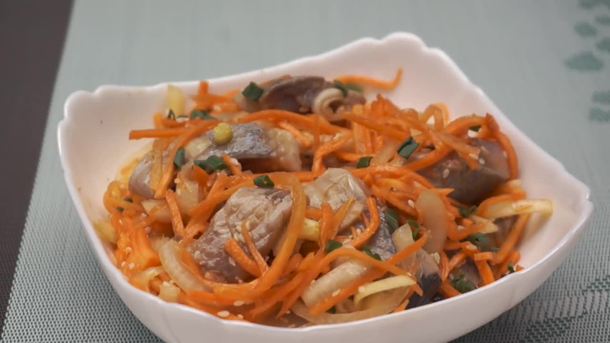 Вкусный и простой рецепт приготовления хе из сельди по-корейски с морковью в домашних условиях. Для приготовления нам потребуется: Перейдём к готовке: Шаг 1 У замороженной селедки отрежаем голову и хвост, удаляем внутренности. Снимаем аккуратно кожу, нарезаем кусочками, удаляем хребет. У замороженной рыбы всё это проще и легче сделать. Выкладываем рыбу на плоскую тарелку, посыпаем её щедро солью (две столовые ложки будет достаточно), оставляем на 1 час солиться. За это время рыба разморозится, пустит сок и будет солиться быстрее. Шаг 2 В глубокой пиале смешиваем винный уксус, 1 ст.л. сахара и немного соли. Ставим в микроволновку на 30 секунд. Уксус не должен закипеть, он должен слегка нагреться, чтобы сахар и соль растворились. Шаг 3 Спустя время стряхиваем с рыбы всю соль, выкладываем её в маринад и оставляем ещё на 30-40 минут Шаг 4 В это время нагреем масло в сковороде. Нарежаем полукольцами лук. Обжариваем лук до мягкого состояния, он не должен стать золотистым. Шаг 5 Сливаем с гот