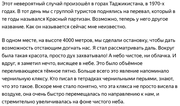 Ночью в лесу, вышел из палатки и заметил нечто объёмное висящее в небе. Когда показал другим участникам группы, началась паника