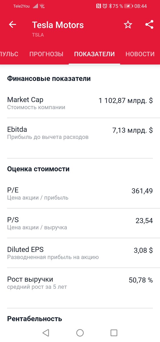 Все материалы блога не являются инвестиционной рекомендацией Компания Тесла занимается производством электрокаров под управлением гениального Илона Маска. Изначально Маск был первичным инвестором компании, далее, когда компания заявила о себе на рынке, начались проблемы, связанные с постоянными доработками электрокаров он возглавил компанию в 2008 году, уже в 2010 году компания вышла на фондовый рынок с ценой размещения 17$ за акцию, сегодня цена одной акции составляет 1144$. Стоит ли покупать акции компании сейчас? Я считаю, что не стоит, по крайней мере, не сейчас и не по такой стоимости. Что меня смущает? Во-первых, цена акции, согласитесь любое движение вниз очень существенно повлияет на портфель. Во-вторых, цена акции в годовых прибылях более 300. Более 300 годовых прибылей!!! Вы правда собираетесь столько жить. В-третьих, очевидно, акция перекуплена со стороны инвесторов. Ну и последниее, меня очень смущает состав и настроение инвесторов, такое ощущение, что акция летит н