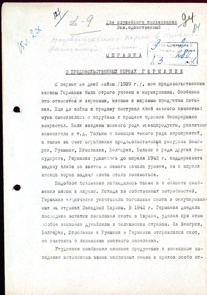 Заявления А. Гитлера о «превентивном характере» войны против Советского Союза (повторенные после разгрома Германии И. фон Риббентропом[1]), а также об «освобождении народов СССР от большевизма», были лживыми. А. Розенберг в речи 20 июня 1941 г. четко заявил о том, что «борьба с большевизмом» – это лишь пропагандистское прикрытие захвата территории Советского Союза[2]. Й. Геббельс беззастенчиво указывал на грабительские цели нацистов: «Сырьевые ресурсы этой богатой страны теперь мы сможем использовать... Итак, вперед. Богатые поля Украины манят»[3] Германия рассчитывала, что Вермахт, напав на СССР не только обеспечит себя продовольствием, но и существенно улучшит продовольственное положение страны. Накануне войны, несмотря на все достижения, в Германии с продовольствием было... тоскливо. се планирующие и руководящие организации, отвечавшие за продовольственное снабжение и сельское хозяйство Германии, находились перед началом и в ходе второй мировой войны под впечатлением продовольственн