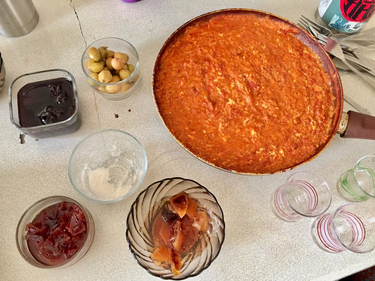 В Турции одна из самых вкусных кухонь. Русские туристы хорошо это знают и именно за это любят здесь отдыхать. Приезжая в Турцию, многие даже сталкиваются с непосильной задачей — как упихнуть в себя всё за 10 дней, тут и жизни не хватит, чтобы «раскушать» всего изобилия блюд. Подача местных закусок в отелях - это одна история, но вот бы узнать, что едят обычные люди. Скорее всего у них такая же приевшаяся домашняя кухня, по типу российского будничного меню, супы да каши. А для этого напрашиваемся в гости к местному турку, ну или, как в моем случае, принимаем предложение пожить вместе с турком. Я погостить люблю, это полезное занятие, всегда можно поучиться чему-то, увидеть собственными глазами местный быт. Завтраки Фуркан устраивал те самые, что вам знакомы. 20 тарелок с разными закусками. С несколькими видами сыров, оливами, с мёдом, сливочным маслом, разными домашними вареньями и так далее. Основным блюдом за завтраком, в основном, был «Мэнэмэн». Это местный вариант яичного омлета с