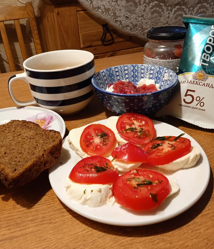 Завтрак. Сыр моцарелла с помидоркой, творог с пюре из яблок с клюквой, кусочек хлеба и чашка кофе с молоком. Всё просто и вкусно. Пюре: варю яблоки с клюквой, без сахара и сахарозаменителей. Баночку храню в холодильнике. Добавляю в творог, к с сырникам и т. д, Варю понемногу, так как яблоки и клюква в супермаркетах стали доступны круглый год :) А мой кофе - это молотый кофе, цикорий, корица и какао. Смешиваю и пью с молоком, чашку в день. Хорошего дня! Больше общения и рецептов - в группе "Жизнь с диабетом" в Facebook! Рецепт на странице в Facebook Автор рецепта - Евгения Комарова