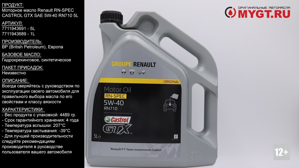 Продукт: Моторное масло Renault RN-SPEC CASTROL GTX SAE 5W-40 RN710 5L Наш телефон: 8-800-550-57-22 ПН-ПТ 9.00-17.00 (МСК+4) Артикул: 7711943691 - 5L 7711943689 - 1L Производитель: BP(British Petroleum), Европа Базовое масло: Гидрокрекинговое, синтетическое. Пакет присадок: Неизвестно Ссылка для покупки: https://mygt.ru/oil/castrol/ ОПИСАНИЕ: Renault - Castrol GTX RN-SPEC 5W-40 RN 710 – полностью синтетическое моторное масло для бензиновых и дизельных двигателей, в которых производитель техники рекомендует использовать смазочные материалы, соответствующие требованиям спецификации RN0710. Применение: Renault - Castrol GTX RN-SPEC 5W-40 RN 710 - полностью синтетическое моторное масло, специально разработанное для применения с увеличенными интервалами замены во всех бензиновых и дизельных автомобилях, не оснащённых устройствами для снижения токсичности отработавших газов. Renault - Castrol GTX RN-SPEC 5W-40 RN 710 одобрено к использованию в автомобилях, в которых предпи