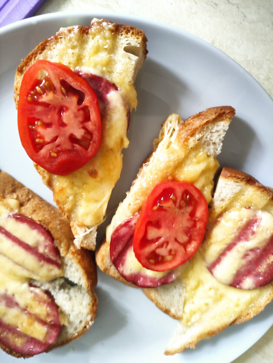 Размеренным будничным вечером раздаётся звонок и радостный голос сообщает о скором приходе гостей!?? В холодильнике пустота, денег чуть больше нуля, но угощать чем то нужно!?? Не беда. Главное раздобыть хлеб, колбасу, помидоры и сыр (этим список не ограничивается, по вкусу можно добавлять чеснок, зелень, лук, приправы). Нарезаем хлеб треугольниками, можно взять самый обычный, либо специальный бутербродный (с ним будет визуально лучше). Складываем все ингредиенты, кроме помидор, на хлеб. Помидоры выглядят красивее в свежем виде, но если нравятся термически обработанные, то советую положить ещё один кусочек хлеба сверху, чтобы получился сэндвич. Наличие гриля, бутербродницы будет большим плюсом, но и духовой шкаф подойдёт. Как говорится, пять минут и готово! Приятного аппетита.