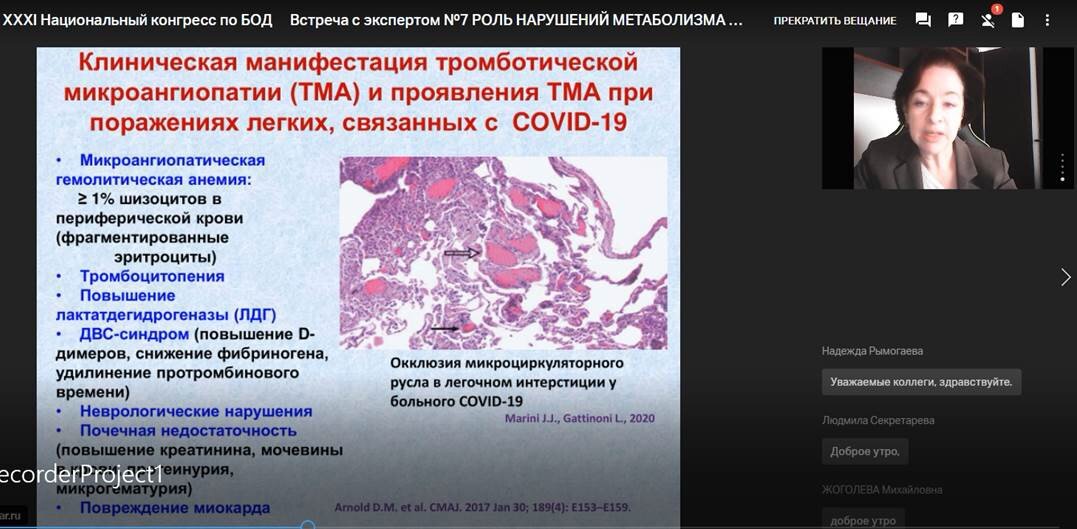 Были представлены результаты многолетней работы сотрудников кафедры в направлении изучения роли факторов тромбогенного риска, эндотелий-опосредованных коагулопатических реакций в исходах респираторных заболеваний; актуальные направления терапии, профилактики и реабилитации этой категории пациентов. Доклад вызвал интерес и вовлек слушателей в активную дискуссию.
