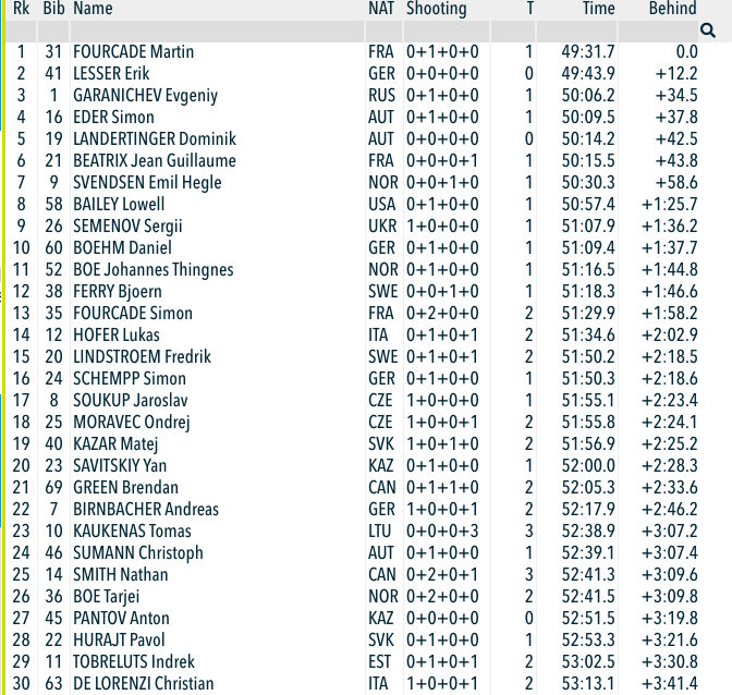 26-летний Евгений Гараничев сенсационно выигрывает бронзу индивидуальной гонки, уступив лишь Мартану Фуркаду и Эрику Лессеру. В этой же гонке вторым из наших становится титулованный юниор 22-летний Александр Логинов, финишировавший с 30 временем и обошедший Евгения Устюгова и Алексея Волкова. В итоге индивидуальная гонка оказалась единственной для Логинова в его текущей истории выступления на Олимпиадах.