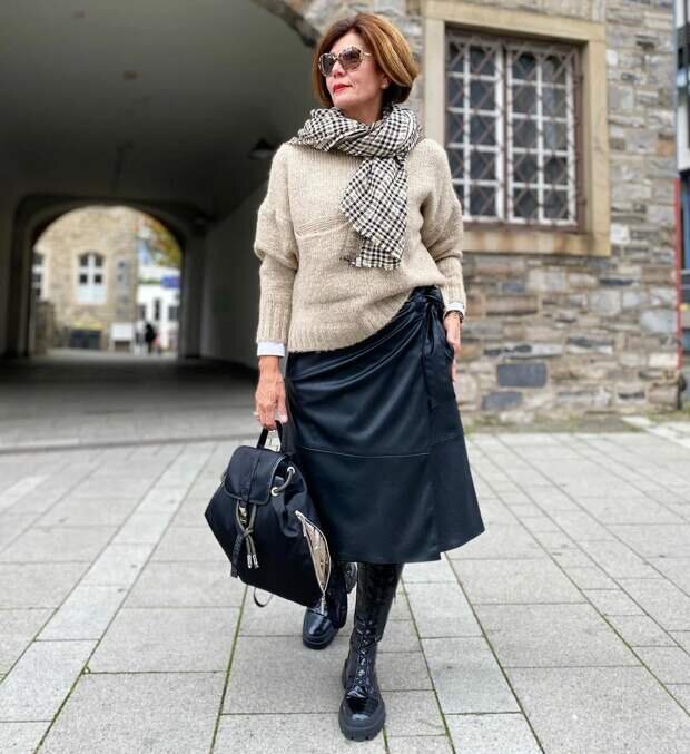 Юбка – обязательный элемент гардероба любой женщины. В возрасте 50+ можно носить любые модели юбок, выбирать модель нужно не по возрасту, а по типу фигуры. Одежда должна украшать женщину, а не искажать пропорции. Кожаные Кожа – тренд сезона, поэтому не помешает обзавестись кожаной юбкой. Модель можно подбирать на свой вкус, это может быть и классический вариант, и экстравагантная модель. С застежкой сверху донизу Прямая черная юбка длиной ниже колена с застёжки сверху донизу – отличная базовая вещь. С ней можно подбирать разные варианты верха. В примере использованы элементы с разными вариантами анималистического принта. Серо-черная блузка с «тигриным» принтом и ботильоны, узор на которых имитирует расцветку кожи рептилий. Дополнительная деталь – черная сумка из стеганой кожи. Джинсовая Базовая джинсовая юбка длиной до середины икры. Модель с высокой посадкой и поясом, по центральной линии переда – разрез. Верх ансамбля – свитер с высоким воротом, связанный из шерстяной пряжи нескольки