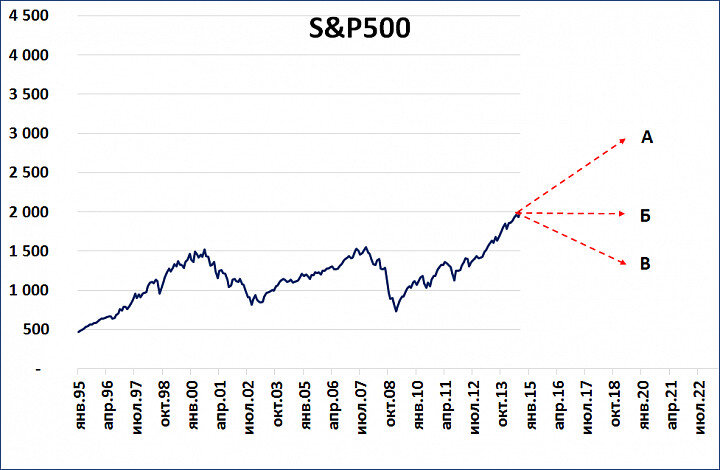 Адам Паркер из Морган Стэнли в 2014 году (правильно) предсказал рост индекса S&P500 до 3000 к 2020 году. Возник вопрос: это он случайно, или и другие его прогнозы хорошо сбывались? Нашёлся его прогноз (если точнее, то это коллективный прогноз аналитиков под его руководством), где он в апреле 2016 года называет 30 акций США, которые к концу 2019 года вырастут лучше рынка. Результаты сейчас уже известны, и можно проверить точность этого прогноза. Но обо всём по порядку. Очевидный сейчас рост не был очевиден в 2014 году Когда в августе 2014 года индекс S&P500 впервые в истории достиг отметки в 2000 пунктов, его дальнейший рост отнюдь не было очевиден. Глядя на такой график, какую траекторию вы бы посчитали наиболее вероятной? Именно такой вопрос я задал читателям своего телеграм канала. Название актива и даже масштаб я изменил, чтобы распознать, о чём идёт речь, было труднее. Только 34% выбрали вариант А (рост), а за вариант В (падение) проголосовало 46%. А вот Адам Паркер из Морган Стэнл