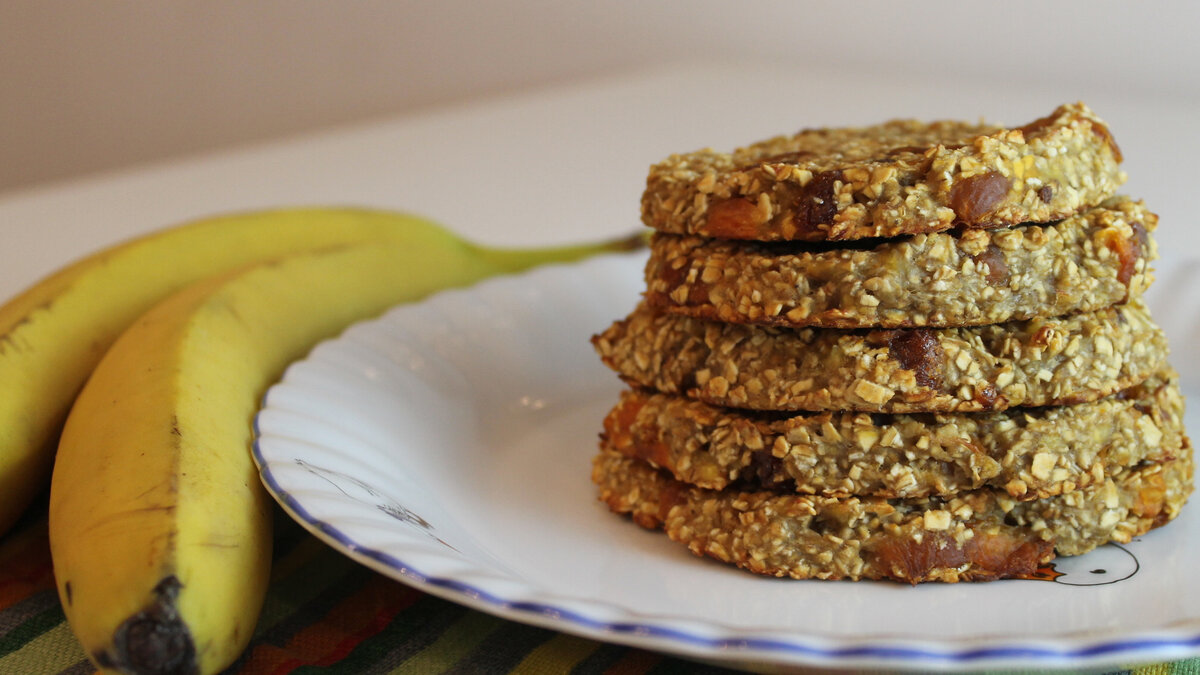 Сегодня мы будем готовить полезные печения. Вам понадобится три ингредиента, всего 20 минут вашего времени, и вы получите прекрасные печенья из овсяной крупы без грамма сахара. (показываю печенья) Ингредиенты: Банан 2 шт Овсяная крупа (быстрая) 150 г Курага 150 г Привлекательность рецепта заключается в том, что печенья готовятся из тех ингредиентов, которые вы скорее всего имеете у себя дома – это бананы, овсяные хлопья и сухофрукты. Вилкой разминаем два больших банана, они обязательно должны быть спелыми, так их легче разминать и спелые бананы добавят сладости будущим печеньям. Добавляем 150 грамм овсянки и перемешиваем. Я использовал овсянку быстрого приготовления, чтобы овёс быстрее впитал в себя бананы. Также для печенья можно использовать овсяную муку. В качестве подсластителя я использовал курагу, вы можете использовать другие сухофрукты, которые вам больше нравятся. Напишите в комментариях, какие сухофрукты вы бы использовали в этом рецепте. Курагу необходимо предварительно з