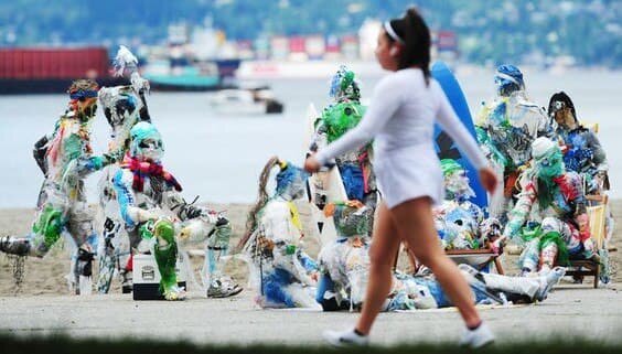 Необычная инсталляция появилась на канадском пляже Китсилано в Ванкувере. Издалека ее можно было принять за живых людей: кто-то играет в волейбол, кто-то загорает. Фигуры полностью сделаны из отходов, собранных на побережье: рыболовные сети, пищевые упаковки, резиновые шлепанцы, кроссовки, солнечные очки и другие пляжные аксессуары. Если бы не течения, которые вымыли их на берег, весь этот хлам остался бы в море на века. Автор скульптур — художница Кейтлин Доэрти. Примерно 80% пластика, попадающего в Мировой океан, поступает из наземных источников. По словам Роланда Гейера, профессора Калифорнийского университета в Санта-Барбаре, «любители пляжного отдыха ежегодно поставляют в океан около восьми миллионов тонн отходов». А если ничего не менять, то уже к 2050 году пластика будет больше, чем рыбы. Из-за пандемии ситуация только усугубилась: рост популярности доставок и ограничение на многоразовые упаковки привели к небывалому распространению пластиковых пакетов, стаканчиков и упаковок. Э