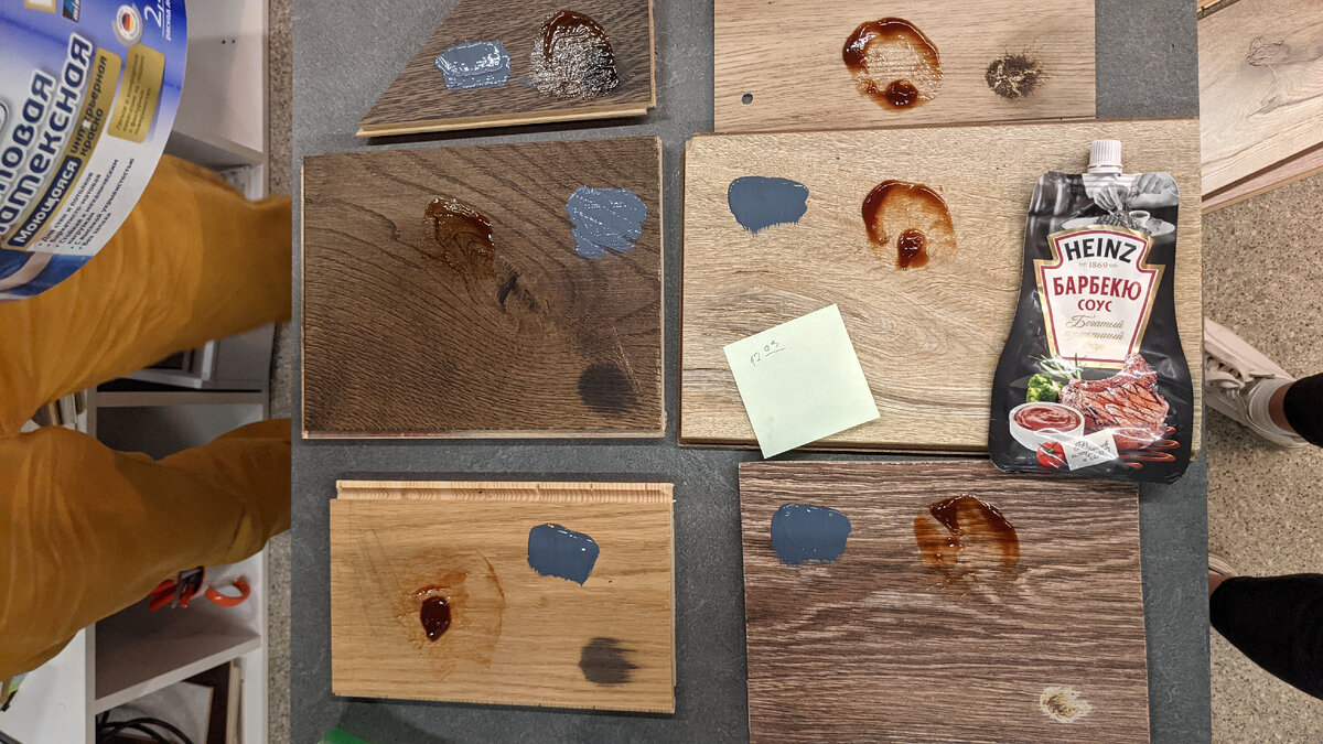 Мы провели испытания, которые вы вряд ли захотите повторить дома. Зато вам будет интересно узнать результаты экспериментов, особенно если в ближайшее время вы планируете ремонт. Испытывали следующие образцы напольных покрытий: - кварц-винил - два вида ламината (подороже и подешевле) - паркетная доска - инженерная доска - доска из массива. Испытание № 1. Устойчивость к влаге При выборе напольного покрытия важно понимать, как оно переносит влагу, ведь от попадания на пол воды никто не застрахован. В качестве эксперимента мы оставили напольные покрытия в воде на несколько часов. Результаты замеряли в два этапа: сначала проверили состояние образцов через 3 часа, затем - через 24 часа. 3 часа в воде выдержали практически все напольные покрытия. Паркет немного потемнел с краю, а дорогой ламинат и инженерная доска слегка искривились (отклонения буквально пару миллиметров, на глаз практически не заметно). За 24 часа изменения проявились сильнее. Оба образца ламината пошли дугой