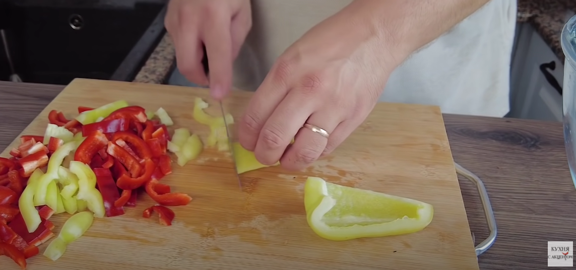 2. Далее нарезаем болгарский перец. Проделываем также с острым перцем и чесноком.