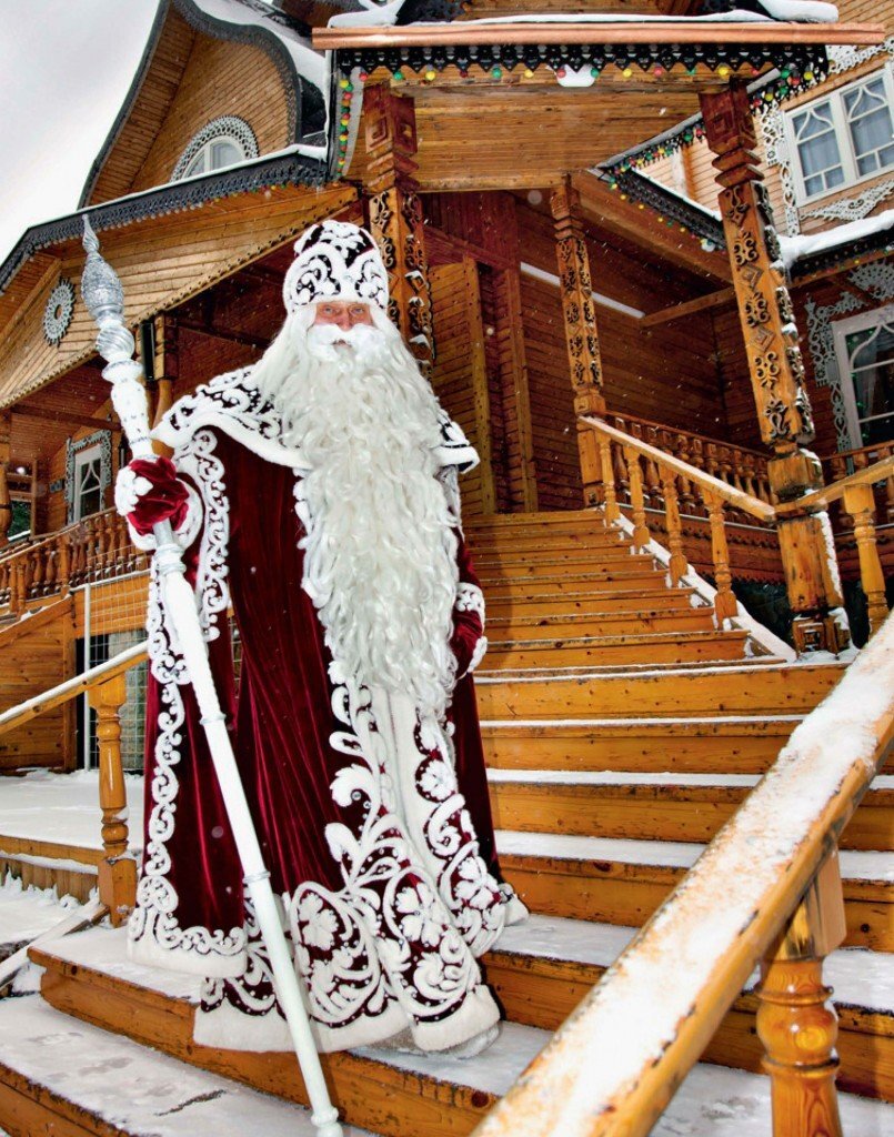 Здравствуйте, мои дорогие друзья. Дед Мороз, главный волшебник Нового года. Он живёт в Северной части России, но не на Северном полюсе. В его доме очень тепло - особенно, когда к нему приходят гости. В России доброго старика, который приносит детям подарки в канун Нового года, называют Дедом Морозом. Это сказочный герой из славянской мифологии, олицетворяющий зиму и холод. Как и его американский «коллега» Санта-Клаус, российский Санта-Клаус получает письма от детей, в которых они рассказывают ему, что хотят получить и как себя вели в течение года. Но в отличие от Санта-Клауса, у Деда Мороза не один, а несколько домов! Пройдемся по его усадьбам. Основная резиденция в Великом Устюге. Этот терем Деда Мороза расположен в сосновом лесу в 15 км от одного из красивейших городов Русского Севера - Великого Устюга (примерно в 450 км к северо-востоку от Вологды, столицы Вологодской области). Он был официально открыт для посетителей в 1998 году и ежегодно принимает более 250 000 человек. Особня