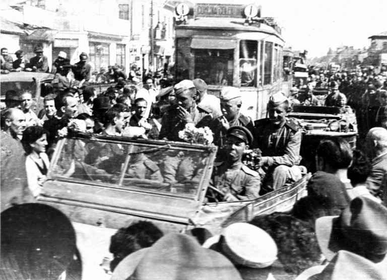 The peaceful inhabitants of Bucharest greet their Soviet liberators from the Nazi invaders – Red Army Force.