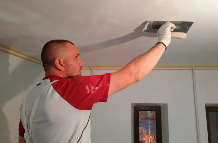 Намазывают и разравнивают только растворы грунта и накрывки. Эти операции обычно выполняют при помощи сокола или полутерки. Для того чтобы обновить лишь некоторые участки потолка, рекомендуется пользоваться штукатурной кельмой.