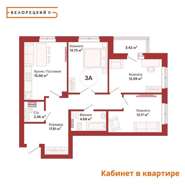 Рассмотрим варианты расположения кабинета на примере трехкомнатной квартиры (на фото).