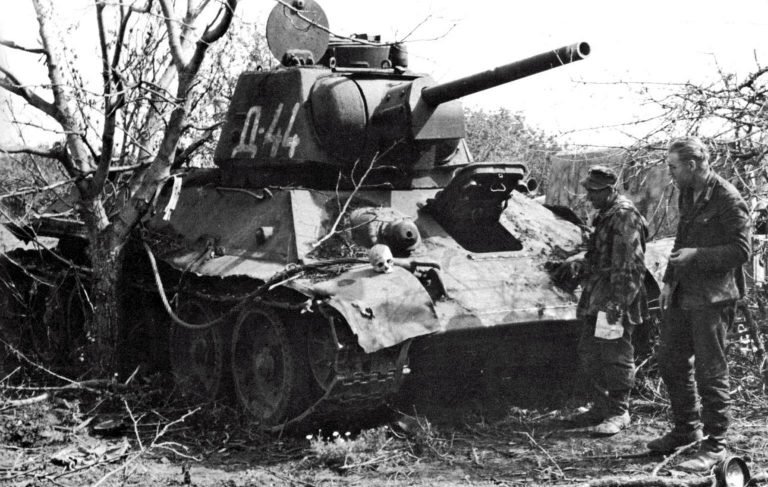 German soldiers of the Nazi Wehrmacht look at the human skull, lying on the armor of the Soviet OT-34 flamethrower tank.