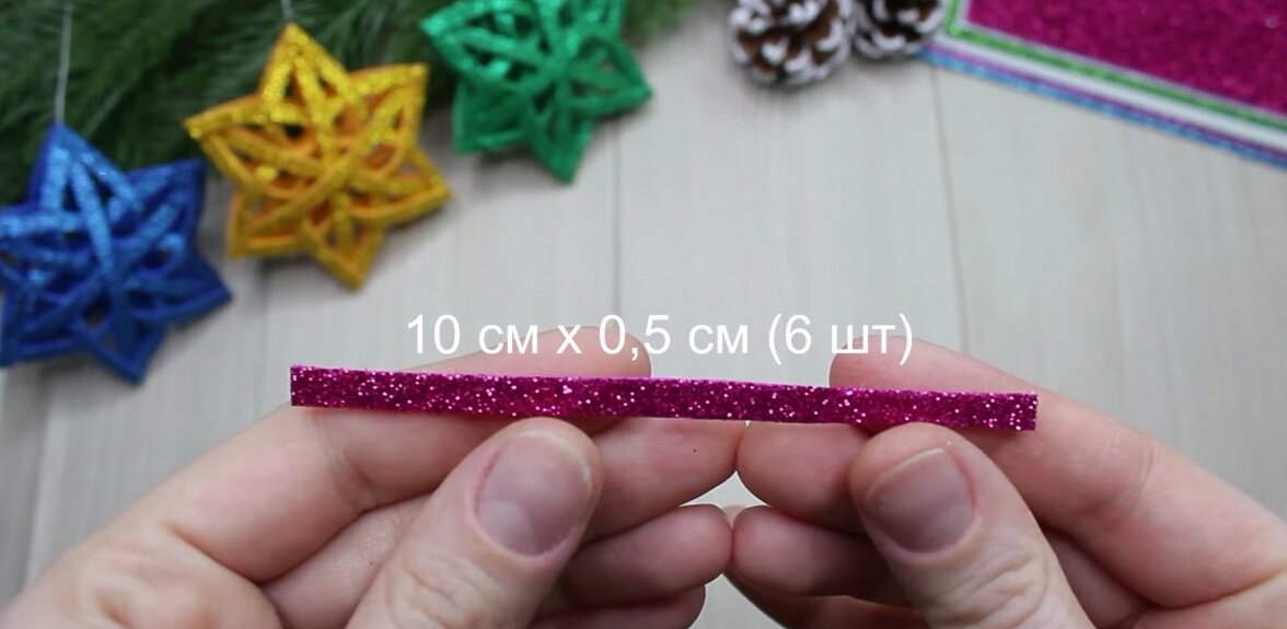 Всем хочется украсить свою новогоднюю ёлку самыми красивыми и оригинальными игрушками. Хочу показать вам, как я сделала новогоднюю снежинку на ёлку своими руками. При этом использовала минимум материала. Для этого я взяла глиттерный фоамиран, декоративный шнурок и клеевой пистолет. Если у вас нет клеевого пистолета вы можете использовать клей момент кристалл. Для снежинки на ёлку нужен отрезок глиттерного фоамирана 10 см на 0,5 см 6 шт. Фоамиран брать лучше яркого цвета, желательно не зеленого, чтобы игрушку было хорошо видно на ёлке. Выбирайте фоамиран толщиной 2 мм, так игрушка получится более плотной. Отрезок складываем галочкой так, чтобы осталось "колечко". Длина конца отрезка должна быть равна 2,5 см. Складывайте все отрезки под одинаковым углом, чуть меньше чем 90 градусов. С помощью горячего пистолета скрепляем отрезок. Так складываем шесть отрезков. С помощью горячего пистолета скрепляем все отрезки между собой. У вас должна получится вот такая заготовка для снежинка, как у