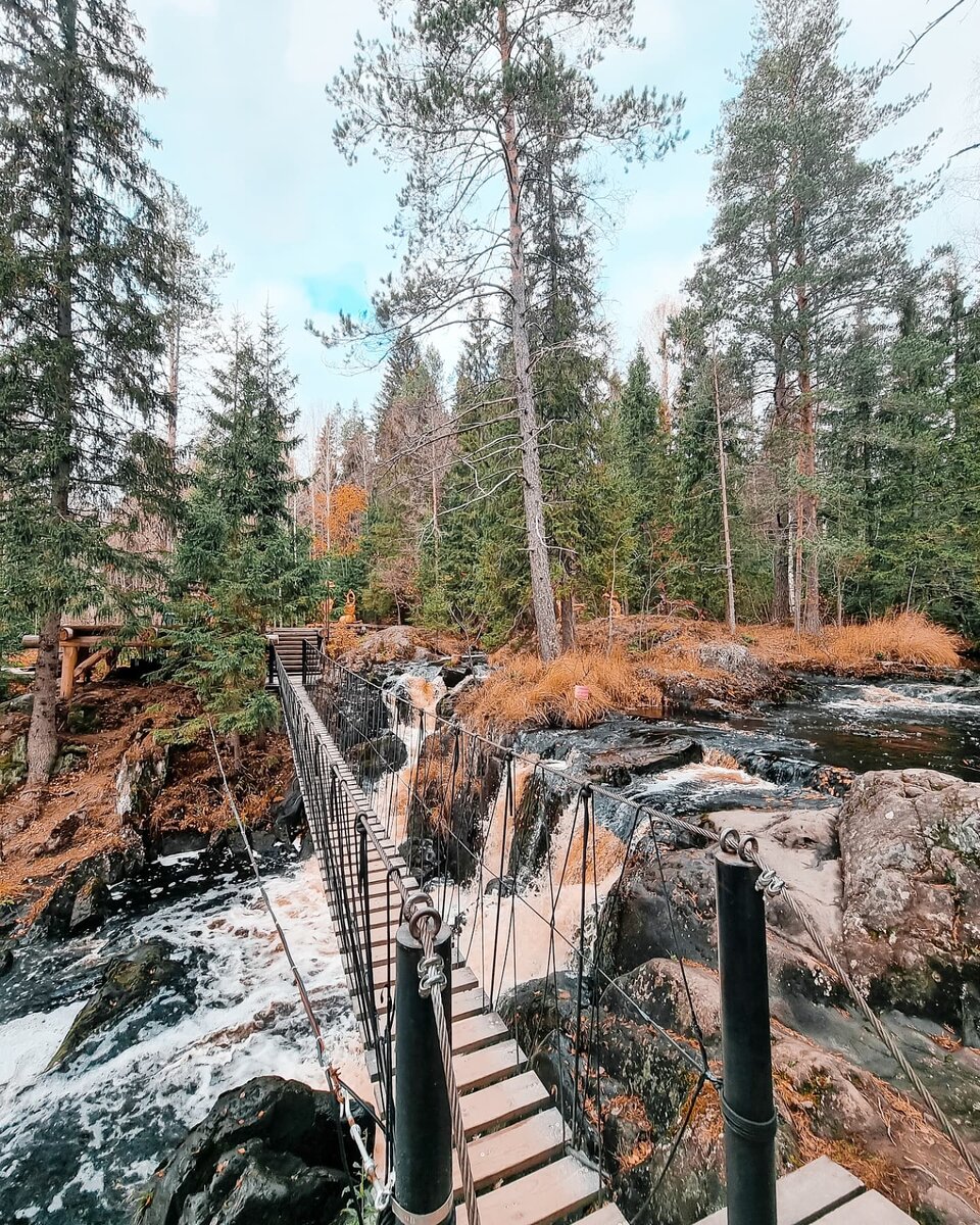 Водопады Ахинкоски, они же Рускеальские водопады — это комплекс равнинных водопадов в месте разлива реки Тохмайоки, находятся они в Сортавальском районе недалеко от посёлка Рускеала и в 5 км от горного парка "Рускеала". Название водопадов пришло еще до войны и в переводе с финского "ахинкоски" означало "пороги водяного". Популярными эти водопады стали после выхода на экраны знаменитого советского фильма " А зори здесь тихие". Я в детстве много раз смотрела этот фильм, но тогда не знала, где он снимался, а теперь даже побывала в этих местах, надеюсь вы тоже видели этот фильм 🙌. На водопадах проложен маршрут с экотропами, включающий несколько подвесных мостов прямо над водопадами. Я насчитала всего 4 подвесных моста. Есть небольшое кафе на улице, где можно угоститься калитками (традиционная карельская выпечка) и иван-чаем, приготовленным в котле на костре 👌. Добраться до водопадов можно на рейсовом автобусе из Петрозаводска до поселка Рускеала, самостоятельно на личном авто или так