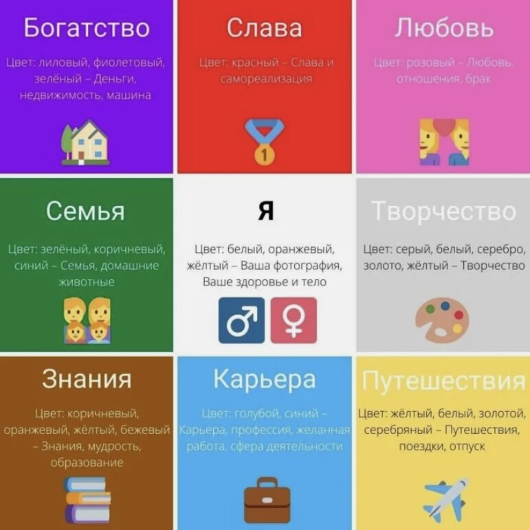 Сектор любви и брака находится в правом углу. Чаще всего загадывают найти свою вторую половинку либо же выйти на новый уровень отношений. Приклейте картинку счастливой семьи или фотографию с любимым человеком.