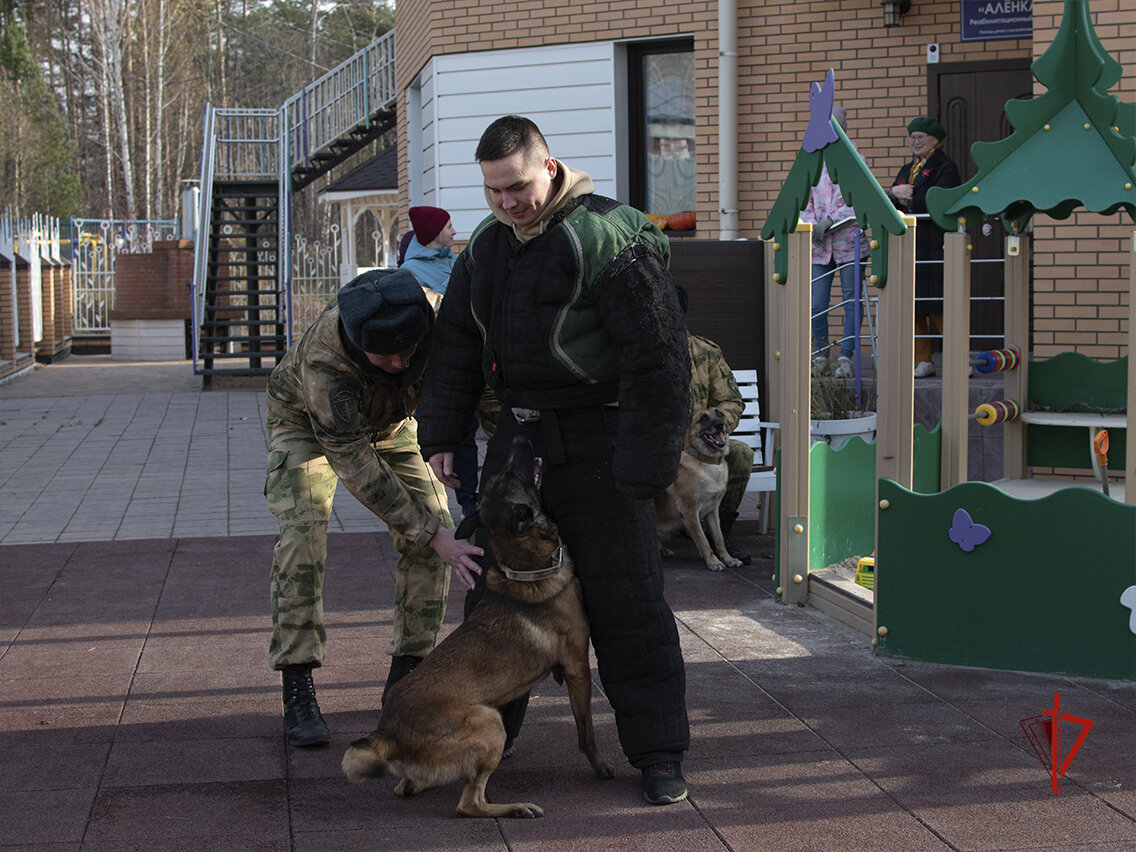 Вниманию детей были представлены показательные выступления кинологов северского соединения со служебными собаками Тайфуном и Тайлером. Бельгийские овчарки продемонстрировали свои специальные навыки, в том числе необходимые для задержания преступников, а также выполнение элементов курса дрессировки. После выступления ребята смогли погладить собак и сфотографироваться с ними на память.