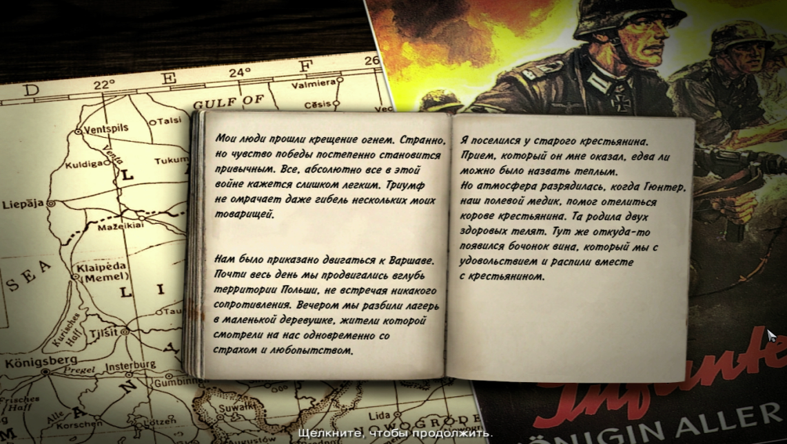 Преодолев сопротивление уцелевших поляков немецкие войска врываются в подвал дома. И... следует странная сцена с непонятным пьяным поляком у котого чудесным образом оказывается в кармане то ли отмычка, то ли вообще ключ от здания штаба. После этого фон Гребелю достаточно подойти к дверям штаба. Миссия завешена. Смотрим финальный ролик и статистику.