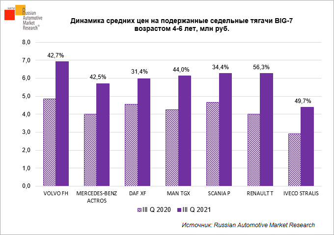 Согласно данным Russian Automotive Market Research, с III квартала 2020 г. по III квартал 2021 г. подержанные грузовые автомобили в среднем подорожали на 7%. Среди подержанных седельных тягачей марок BIG-7* возрастом 4-6 лет наибольший рост средних цен за год показала модель RENAULT T (+56,3%). Меньше всего прибавила в цене модель DAF XF (+31,4%). ____________________