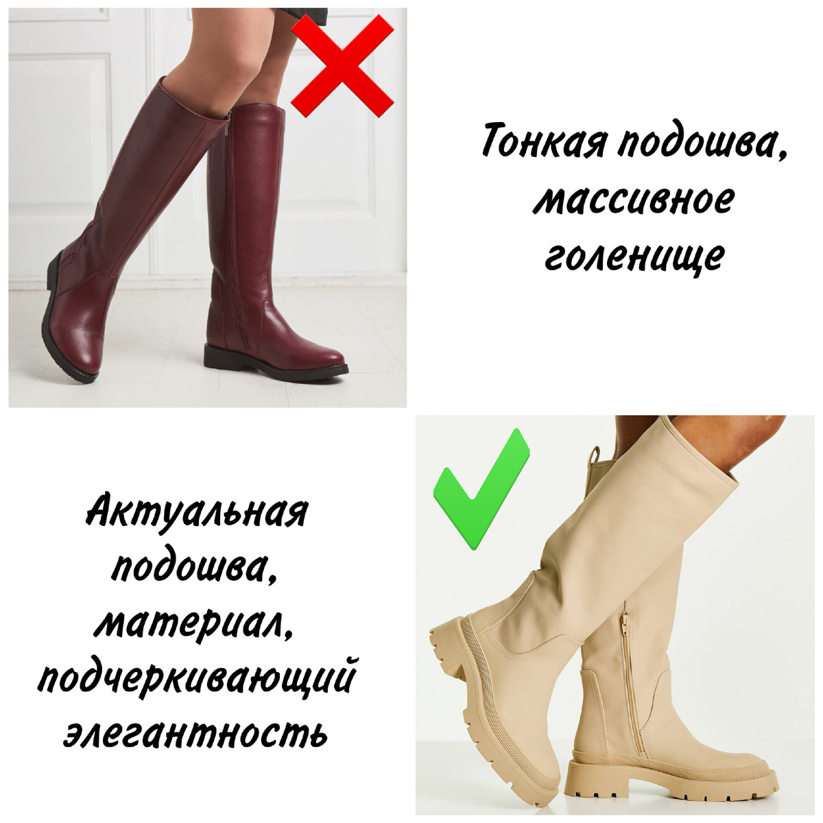 В этой статье мы разберем актуальные модели обуви на осень 2021 года, а так же анти тренды, от которых по возможности нужно избавиться. Для начала рассмотрим сапоги, это модель, полюбившаяся многим девушкам за счет своей практичности и универсальности. Сапоги станут отличным решением для дождливой и ветреной погоды, спасут от холода и влаги. В 2021 году лучше отказаться от моделей на тонкой подошве, с широким голенищем. Они визуально укорачивают ногу, делают образ слишком простым и несуразным. Предпочтение стоит отдать моделям с более высокой подошвой, кроме визуального эффекта она защитит ноги от промокания. Для тех кто любит укороченные модели отлично подойдут различные варианты ботинок. Для них так же актуальна тракторная и массивная подошва. При выборе лучше отказаться от моделей, перегруженных декоративными элементами в пользу более лаконичных вариантов. Для любителей грации и небольшого каблука отличным решением станут ботильоны. Самыми актуальными являются модели с геометричес